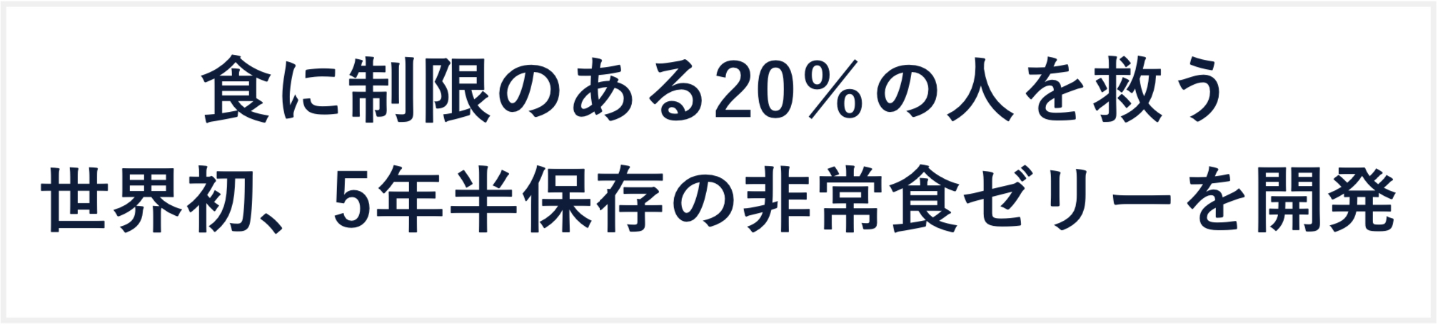 このピンポイントの課題を解消するために生まれたのが、電気や水、ガスなどを使わず食べられ、5年半常温保存が可能な世界初の非常食ゼリー「LIFE STOCK」だった。極度のストレス状態であっても甘さを感じ、美味しくエネルギーを補給することができる。栄養面でも食物繊維やビタミン類など、バランスを考えて作られた。
