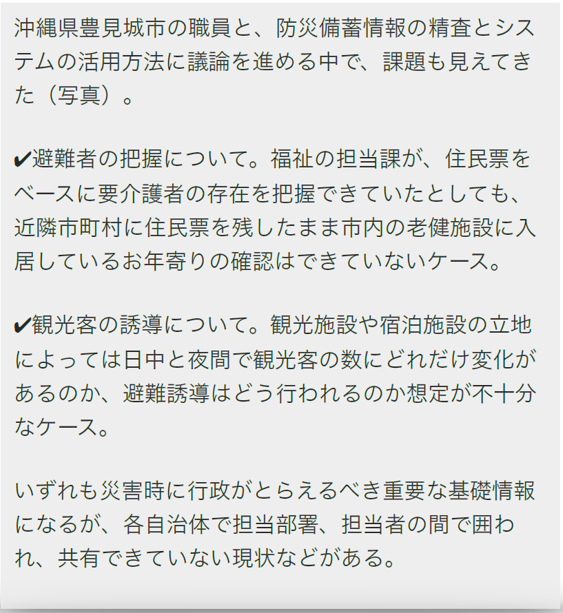 中西社長は「行政特有の悪気のない縦割りがあり、数人ずつの部署間でもお互いの情報を知らないという状況が起きている。有事の際の行動を想定すると、どうしても人海戦術にならざるを得ない。災害時には、避難所運営の担当者は各現場と連携していく必要がある。どのような流れで連携をとっていくのか、実際のオペレーションがイメージできるようなシステムにしていきたい」と話す。